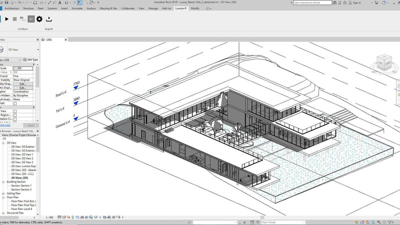 A luxurious modern beach villa with interior and 3d grass, house, BIM model is made on Revit Architecture and rendered on Lumion10 . Designed by a professional team of architects and interior designers. the design can fit on any site with a nice view ( better with a shore ). Cozy transparent spaces make you live the inside like you are outside, every corner of the house is studied well to give you a special different experience. the villa is G+1 with a courtyard, swimming pool, dining, bedrooms, guestrooms ... etc.