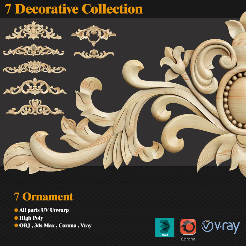 This file contains four ornaments with high polygons. You can use this product in the interior decoration of classic scenes. This product is in the category of classic products. I tried to do this model with the utmost care and elegance. All objects are uv unwraped and you can use another texture on them without any hassle. You can even apply that color. This product can also be used on classic objects. Including objects such as: dresser, classic chair, classic bed, classic wardrobe and ...... I have modeled them with 3D Max. Can be used for both Corona and Vray rendering engines. There is also OBJ file in this product. You can apply the Turbo Smooth command if you need objects to have better quality. Of course, I have tried to manage the number of players so that your scene does not take up too much RAM on your system. I hope you enjoy this and support me. Thanks