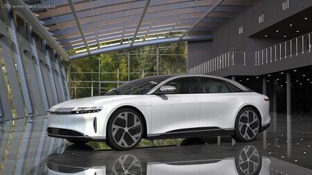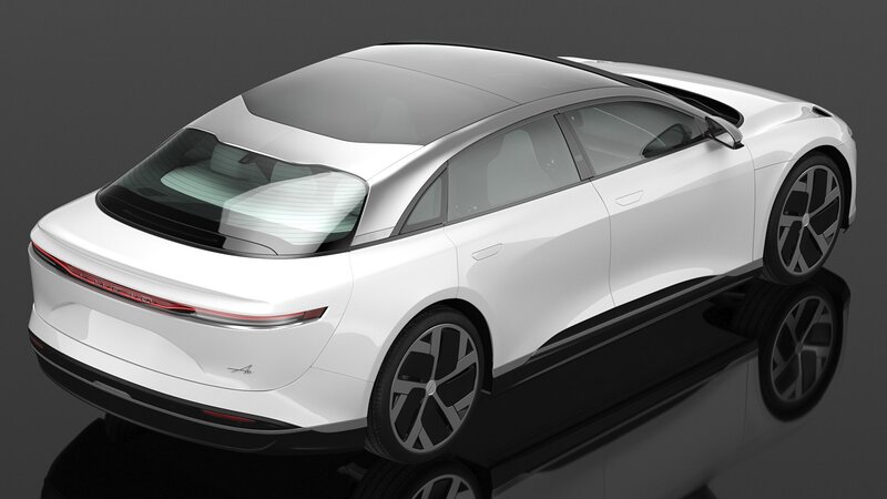The futuristic high tech electric luxury Lucid Air sedan all-wheel-drive plug-in EV car transport.