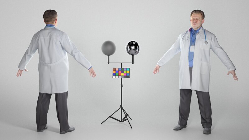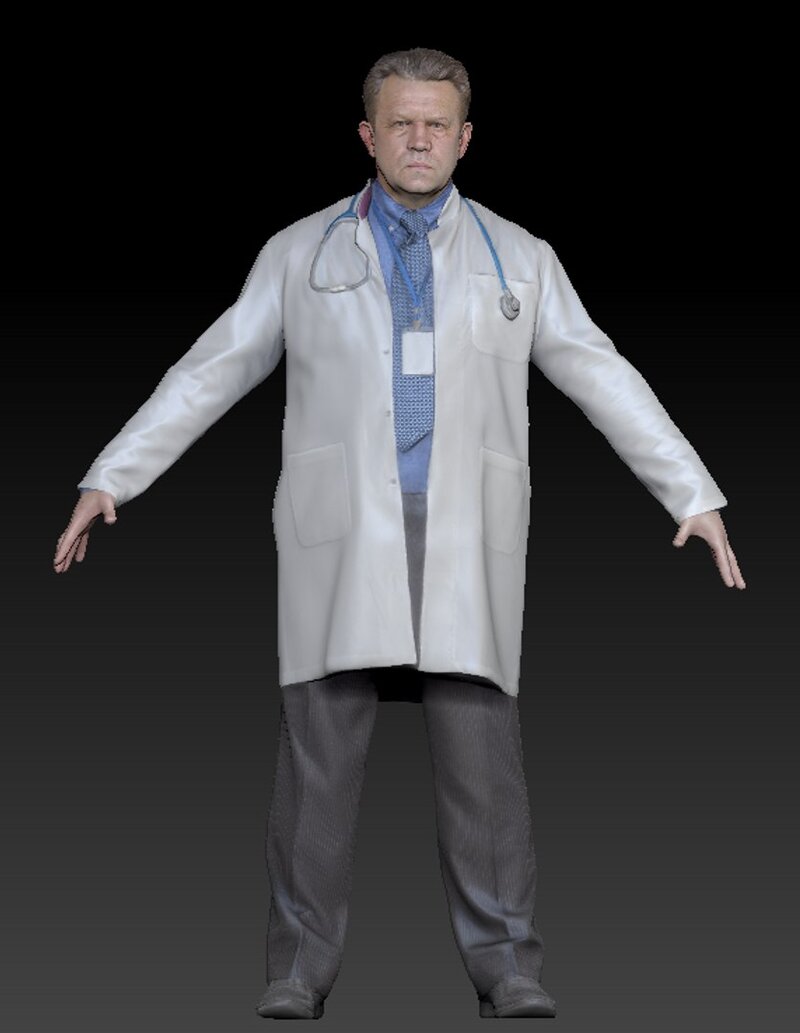 This is a true human size and detailed model of a man of Caucasian appearance dressed in a uniform of a medical doctor. The model is captured in the A-pose with mesh ready for rigging and animation in all most usable 3d software.