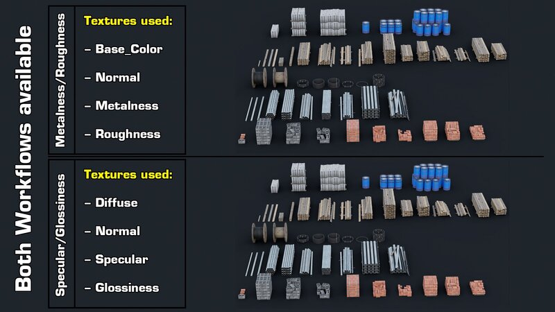 - Both Metallic/Rough and Specular/Gloss PBR workflows are available