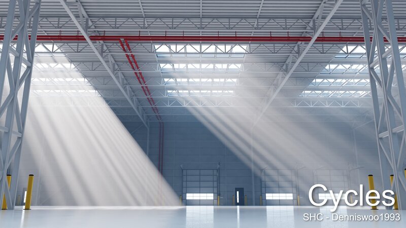 This is a large modern industrial warehouse for Blender Eevee and cycles. (interior only) Everything in the scene is originally designed and modeled.