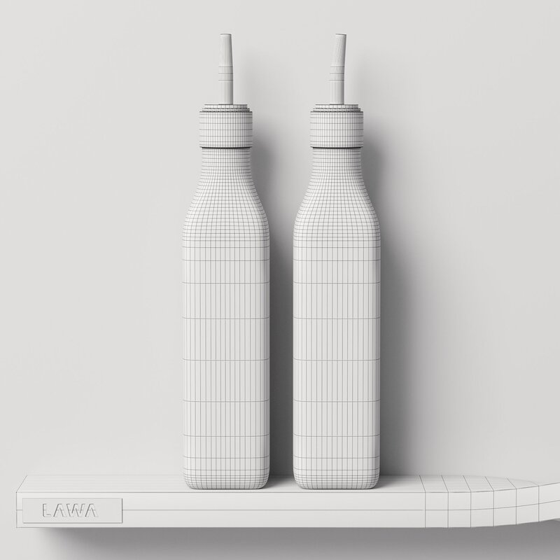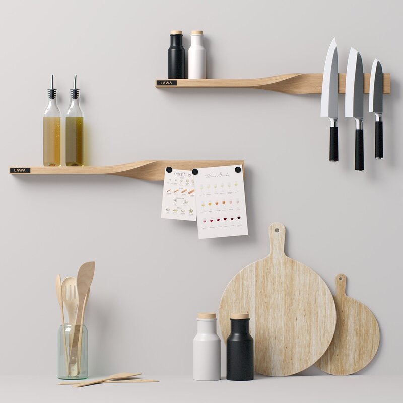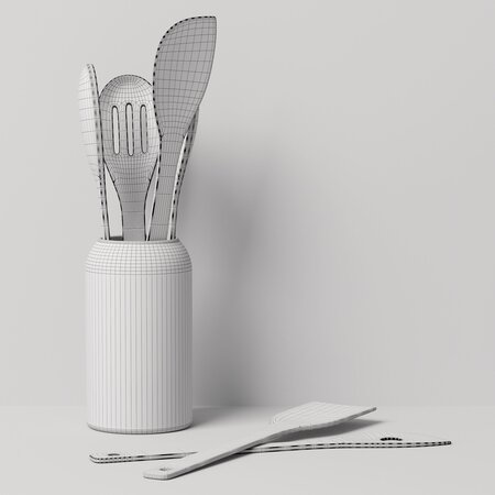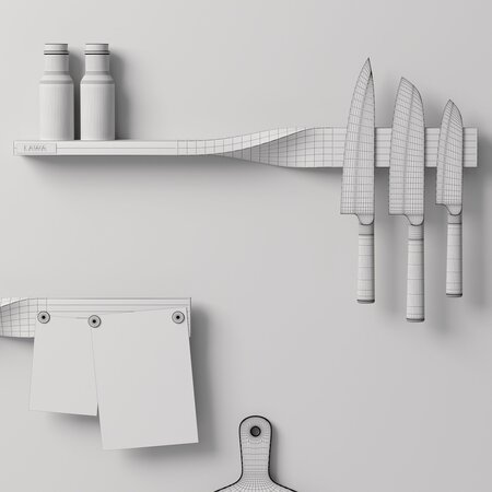 *This 3d model Decor Set 91 Rolled shelves, kitchen boards, oil bottles, spice jars, knives and spatulas in a vase has fully textured, detailed design that allows for close-up realistic renders. *